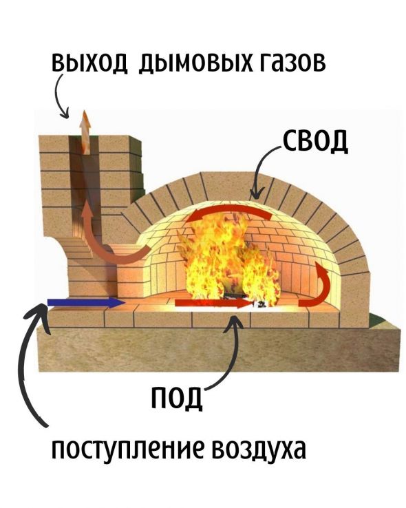 На плоском основании, называемом «под», размещают дрова и разводят огонь. Вся внутренняя поверхность, включая купольный свод и основание (под) нагревается.